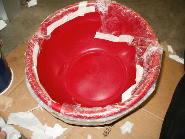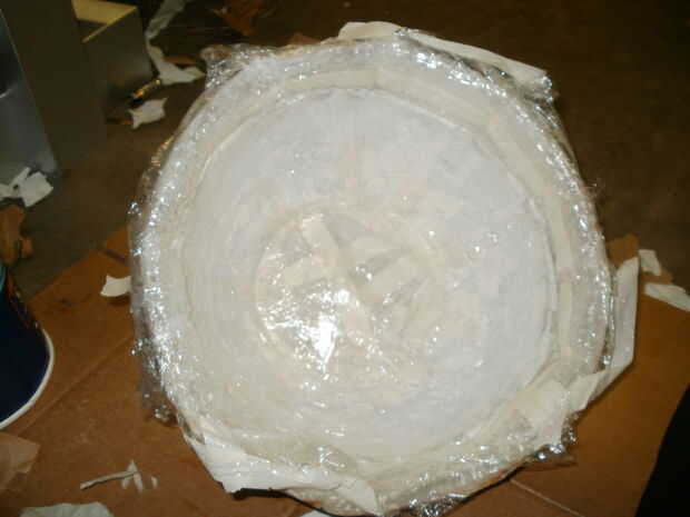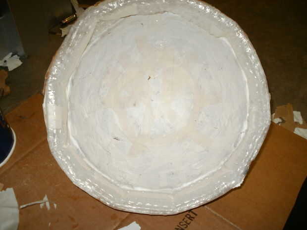 Trabajar cuidadosamente el recipiente de su papel maché.  Asegúrese de que dejar el abrigo de burbuja para el borde de la cáscara de la tortuga. Luego retire el envoltorio plástico.  Ten cuidado con esto, la cinta adhesiva todavía está conectado a la envoltura de plástico y pegamento.  También quité la pieza superior que he añadido a la "parte inferior del tazón de fuente".  Puede que tenga un par de tijeras a mano para cortar cinta adhesiva pero su mejor no eliminar completamente la cinta.