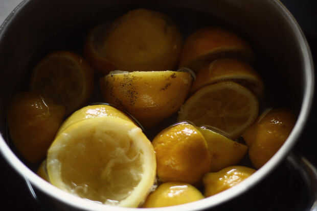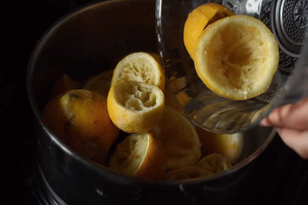 ¿Cuánta agua? Apenas agregue el agua hasta que cubre la corteza de limón. El limón más cáscaras, más agua.