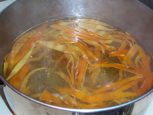 En la estufa, calienta una cantidad igual de agua y el azúcar. Como se indica en las instrucciones, esto puede ser cuatro tazas de cada una o dos tazas de cada uno, dependiendo de la cantidad de cáscaras de fruta involucrados. Dos tazas de cada uno parece ser un montón de dos pomelos. Cuatro tazas de cada uno era un montón de jarabe en comparación con el valor de tres naranjas de cáscara. Experimentación le dará los mejores resultados.