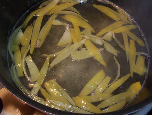 Poner el azúcar y el agua a hervir. Pueden revolver la mezcla en este momento para ayudar a que el azúcar disolver más rápido. Una vez que el azúcar se disuelva completamente y el almíbar hierva, añadir las cáscaras y gire el calor a fuego lento.