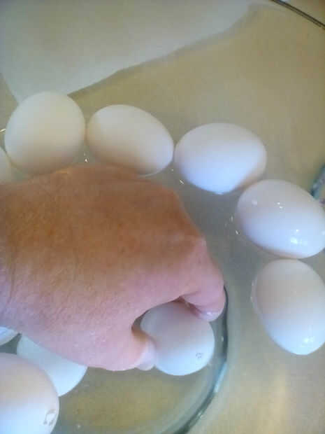 Llene un recipiente grande con agua tan caliente como usted puede estar parado. Sumergir cada huevo en el recipiente permitiendo que se llene con el agua caliente. Disfruta viendo las burbujas salir del huevo.