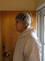 Este es mi (cerca de $30) y casco de LED, que se basa libremente en los cascos de Daft Punk como se ve en el vídeo de la música "Algo acerca de nosotros".La caja negra en el extremo de un cable gris contiene un Arduino, lo behold. El cable gris,