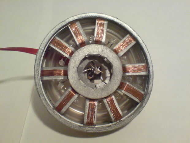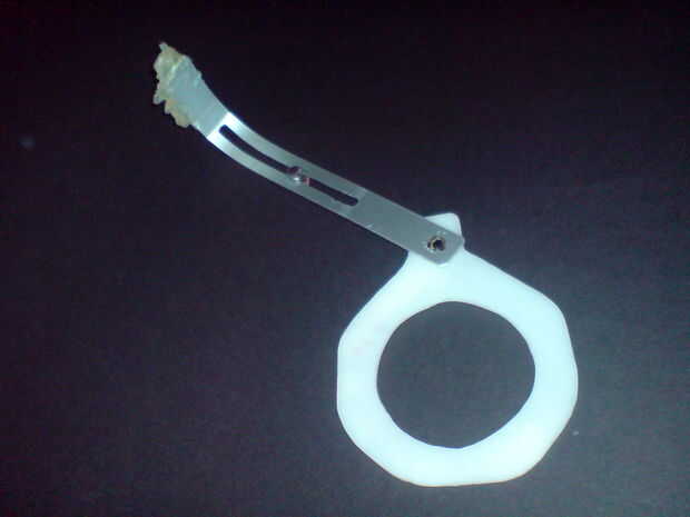 La placa frontal está conectado a un mecanismo slider rotatorio (similar a un arreglo de biela de motor) que empuja la placa hacia fuera y luego levanta girando la pieza de oído izquierdo. Entonces seis LEDs azules de 3mm y algunas resistencias se unen a una batería de 9V y un interruptor para iluminar los ojos que se cubren con unos lentes azules de un viejo par de gafas de sol de moda.