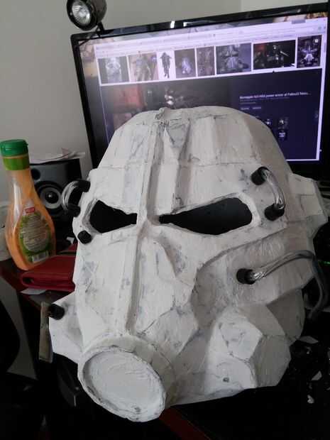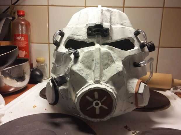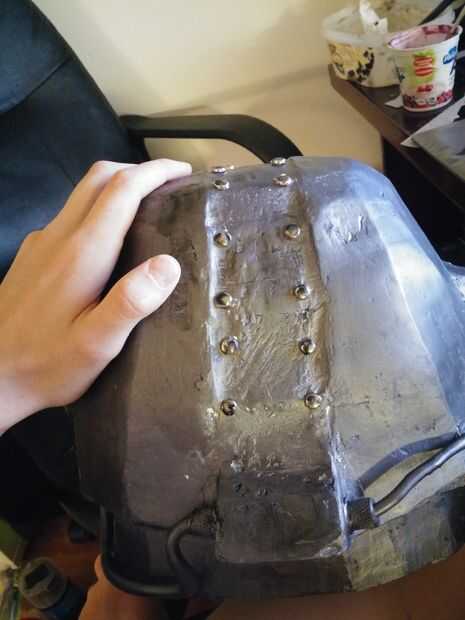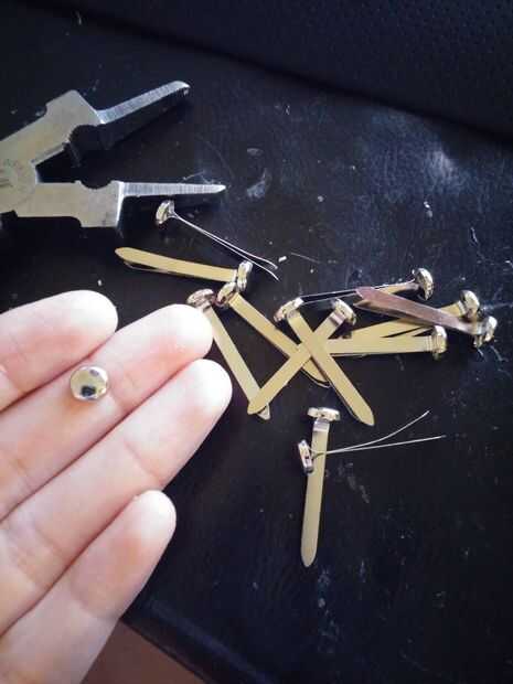 Encontrar estos remaches o pernos en una tienda de actividad (puede utilizar ojos saltones si quieres). Les pegué con pegamento caliente a la parte trasera y sobre la cabeza y 2 delante del casco.