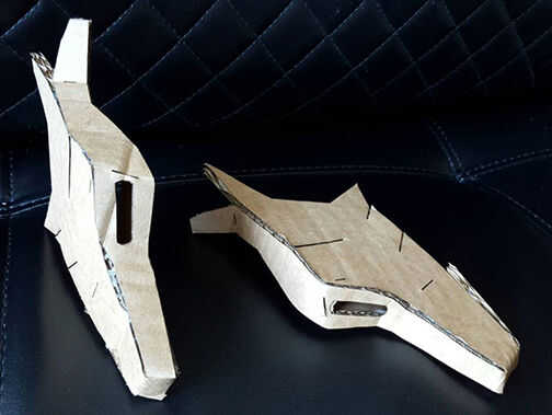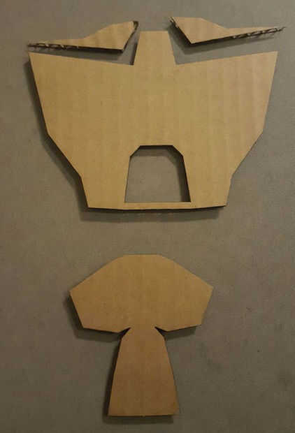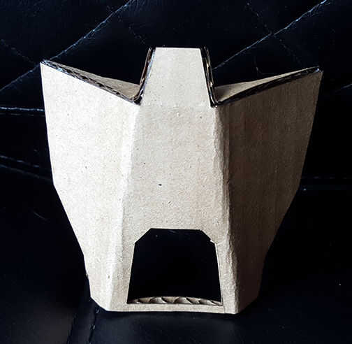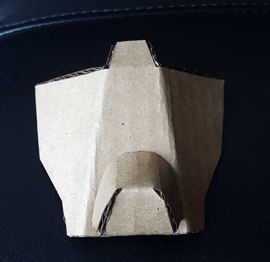 Recoger las piezas de "boca" (imagen 1) y utilizar la regla regla para doblar a lo largo de los vértices en la nariz / boca de la pieza y doblar bruscamente (imagen 2). Utilizar las dos piezas más pequeñas para informar al ángulo del doblez y pegar en su lugar (imagen 3).