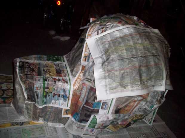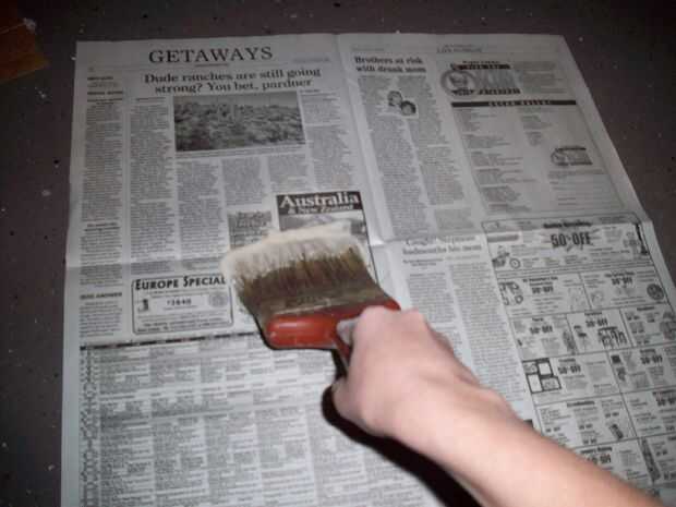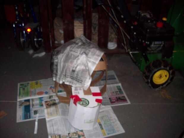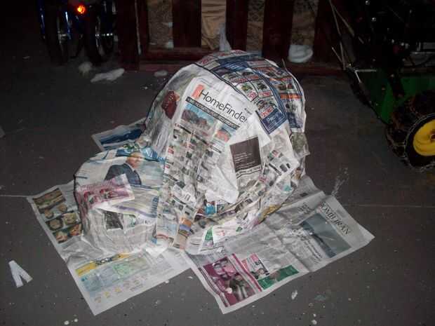 Para el papel maché, tomar una brocha, cepillo sobre el periódico y acople para el casco. Aquí está la receta que usé, que terminó con dos lotes: 2 tazas de harina 2 tazas de agua sal 1 cuchara Si lo desea, podría utilizar una receta más complicada, sino esta trabajado para mí.