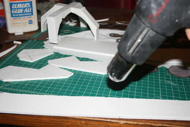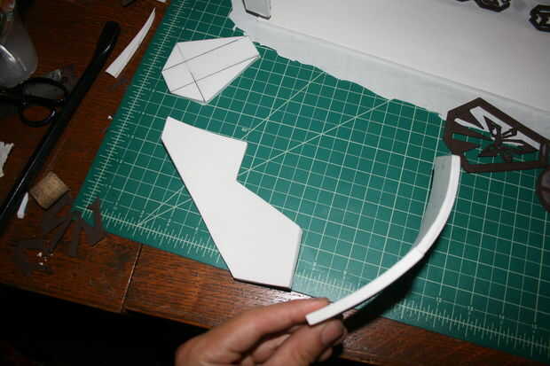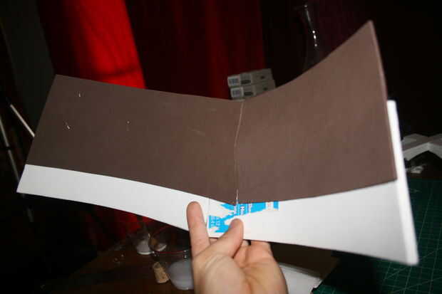 Adelante, la placa de cuello y oído alrededor del borde inferior del casco. Para ello utilicé lo que quedaba de mi espuma de 1/8" para actuar como un parche entre el interior del casco y el interior de la placa. Este asimiento fue reforzado más adelante por los lazos zip sirve para conectar las jarras a los lados.