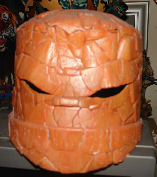 Materiales: recipiente de helado de 5 galones, envases de espuma de poliestireno, pistola de pegamento caliente y palillos, alfombra y o x-acto cuchillo, pintura acrílica naranja, agujero de sacador, metal sujetadores (ligero, tipo escolar de color oro), venda de elástico (para mandíbula mecanismo de apertura), grapas de la grapadora