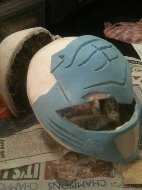 el sistema de pestillo power ranger es bastante fácil. separé la máscara en sus 2 partes y utiliza bandas de tejido elástico pegados a cada parte dentro de la máscara para mantenerlos juntos.