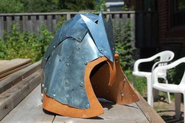 Este casco de cuero endurecido es ideal para representando ferias renacentistas y accidentalmente asustar a los vecinos. Este tipo de casco es bueno porque no requiere grandes trozos de cuero o piezas de espesor uniforme, por lo que puede ser hecho d