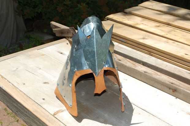 Este casco de cuero endurecido es ideal para representando ferias renacentistas y accidentalmente asustar a los vecinos. Este tipo de casco es bueno porque no requiere grandes trozos de cuero o piezas de espesor uniforme, por lo que puede ser hecho d