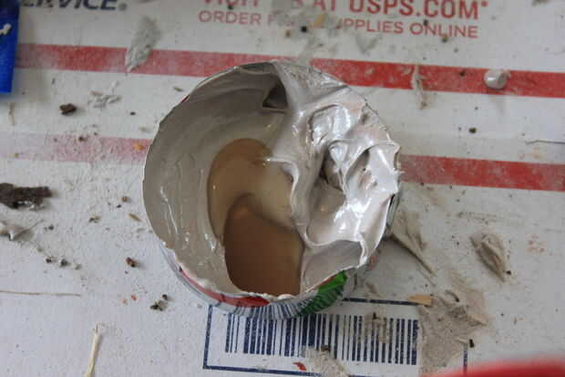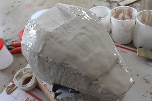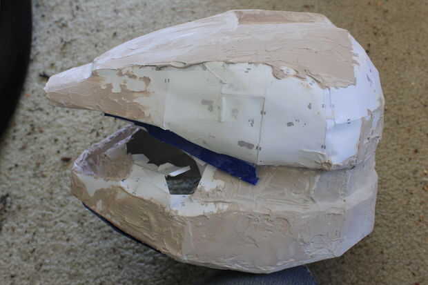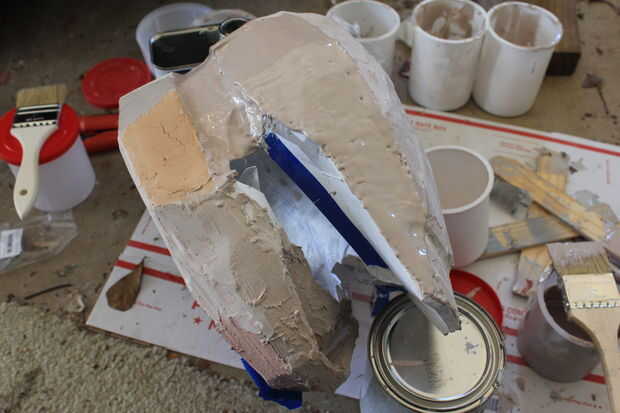 Este paso siguiente tomó un tiempo para completar porque lo hice en secciones. Decidí intentar algo diferente a lo que había leído de otros proyectos de los pueblos. En vez de colocarle el bondo y lijar y repetir el proceso varias veces, hice la mezcla más de un líquido y extensión sobre el uso de un pincel.
