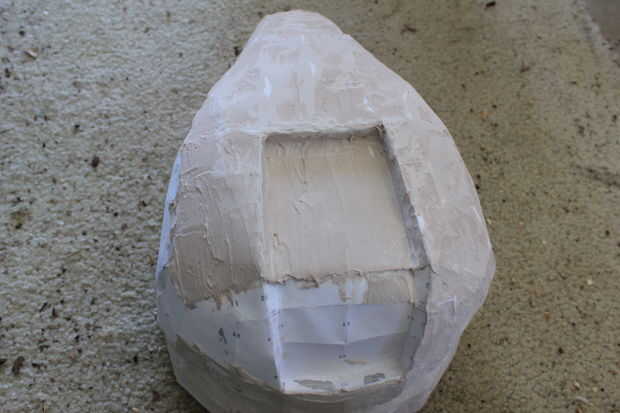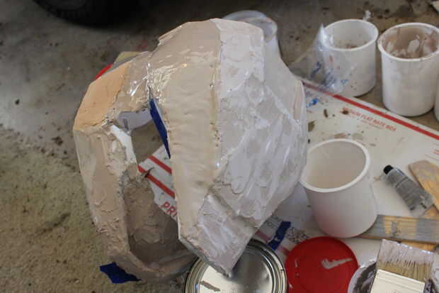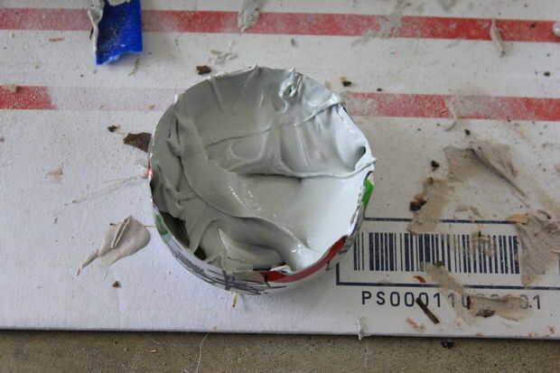 Este paso es similar al paso anterior excepto que tengo algunas mediciones de better(ish) para su uso! Tenía algunas latas de Diet Coke sobrante así que tomé un marcador y dibujó una línea recta (sobre todo) por debajo de la parte donde dice Coca-Cola con sabor a Lima alrededor de todo el camino. Entonces lo había cortado con mi cuchillo de bolsillo pero puede usar lo que quieras. Esto actuaba como mi taza para la mezcla que iba a hacer. Llena la parte que sólo recorte de Bondo llenador del cuerpo, casi lo suficiente para llenar la parte entera y luego añadió un poco chapoteo de la resina. Agregue endurecedor, mezclar bien y luego asegúrese de que es un líquido. Debe ser sobre la consistencia de la salsa de chocolate, excepto que debe correr más suave. A continuación, utilice el pincel que hay que esparcir la mezcla de (resina y bondo) este Rondo sobre el casco. Asegúrese de que es lo suficientemente gruesa para que no se ejecuta por todo el lugar. El Rondo debe fijarse fijar cualquier protuberancias que ha hecho y si hay algún agujero pequeño en la mezcla acaba de poner más en tu cepillo y ve sobre él otra vez. Asegúrese de que usted no está haciendo demasiado en uno tiempo y dejar que las manchas que seque antes de los bancos su casco a otro lugar. También, no deje que los perros la cola accidentalmente cepillo en el casco mientras está todavía húmedo.