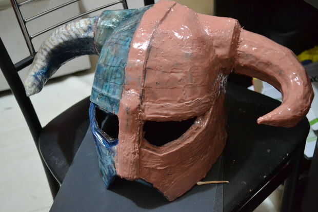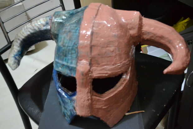 Ahora poner un poco en los cuernos y un poco en el casco, justo donde vas a conectar los dos. Secar un poco entonces palo los cuernos en el casco. Usted puede poner cinta alrededor de ella para el apoyo para que no se desalinea. generalmente se seca en 3 horas y cura totalmente en 8-10 horas.