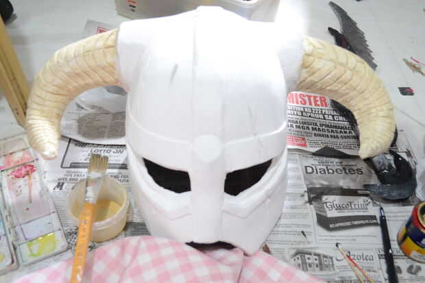 Luego mezcle unos marrones y amarillos con agua y lávela sólo sobre los cuernos. de esta manera la pintura se filtre a través de las abolladuras y vería como la suciedad en su cuerno. Repita este paso hasta que esté todo bien con cómo se ve.