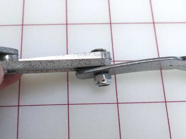 Tomé los trozos de venda había rociado plata y perforado de agujeros en los extremos. Luego usé un perno y tuerca para sujetar a los transportadores, creando una junta con bisagras.