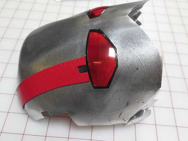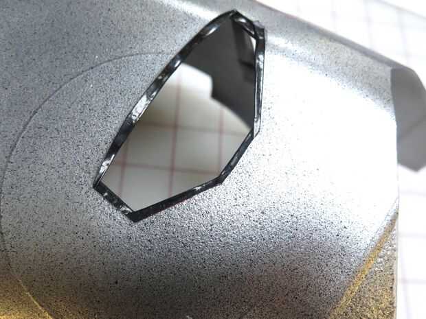 Rocía mi placa frontal con el mismo combo de plata/negro que había utilizado en las otras partes, entonces utilicé cinta negra al borde de los orificios de ojos y pegar las lentes de las gafas de seguridad al interior.