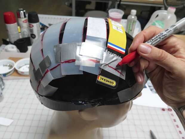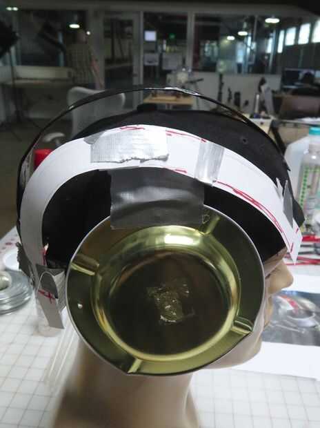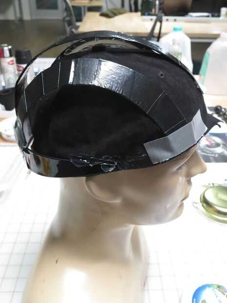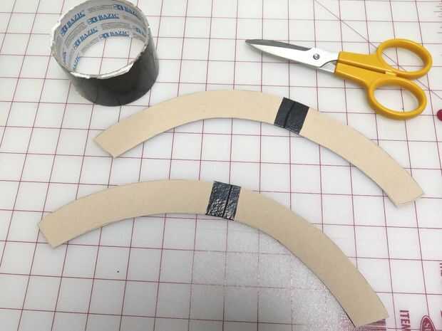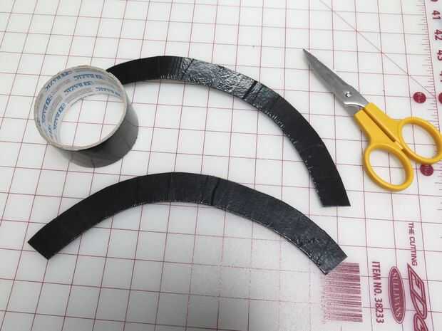 Con los pedazos de oreja con cinta en lugar de referencia, utilicé papel para determinar la forma general de los dos listones que funcionaría a lo largo de los lados de la cabeza, completando el understructure. He creado estas piezas laterales de la cinta de cartón y negra.