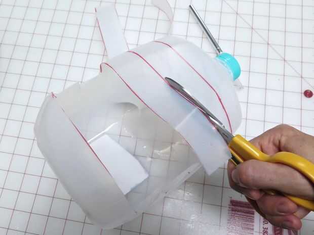 Luego corté 1.25" tiras de ancho de la cima de una jarra de leche de plástico para crear los listones superiores. Cartulina también funcionarían bien aquí. Arreglaron las piezas encima de la cabeza y viro ellos abajo con cinta, luego, marcada donde tenía que recortarlo.
