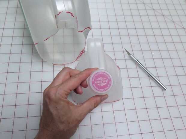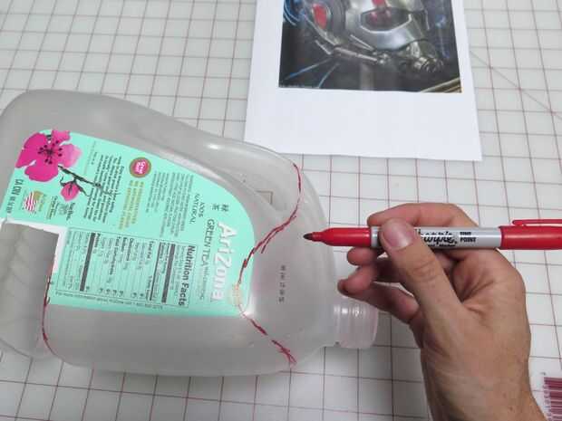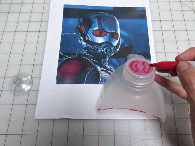 Hace referencia a mi foto de la parte delantera del casco dibujó una forma para la moithpiece en la parte superior de una botella de té helado. Usé mi xacto para recortar esta pieza y también cortar los orificios de ventilación en la tapa de la botella. He cortado unos trozos más de la botella de plástico y caliente pegado a los lados de la pieza de la boca para imitar el detalle en esta parte del casco. la magia de la pintura de aerosol de plata es que detalles que parecen plástico y janky ahora se ven como son metal real cuando tienen un uniforme de plata.