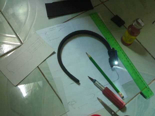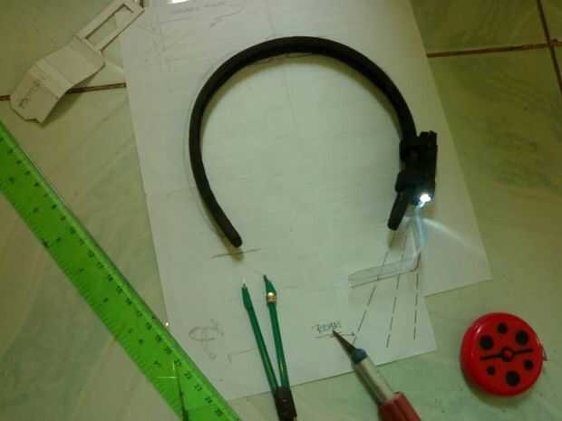•i utiliza espuma eva para este proyecto con 12gauge aluminio barra embebido en diadema para la flexibilidad. Y PETE transparente plástico como pantalla.
