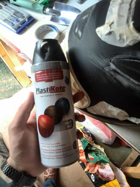 Estoy usando aerosol negro mate plastikote. Reglas generales deben agitar bien antes de rociar, para aplicar unas capas y dejar secar por 20 minutos en el medio. Asegúrese de rociar uniformemente.