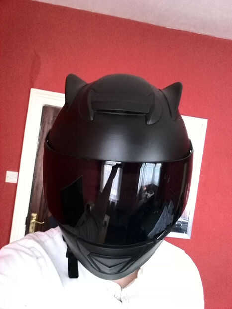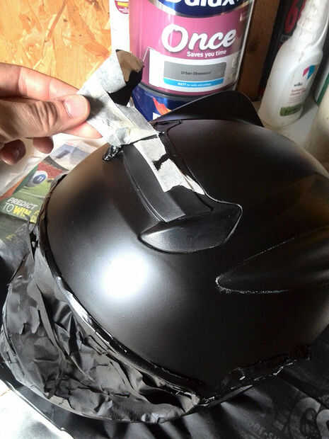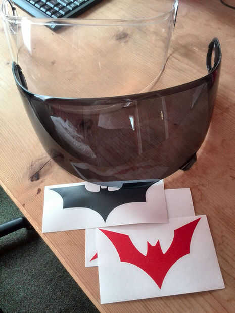 Poner un visor negro teñido si casco original vino con uno transparente (mantenga e interruptor depende de tiempo de un día. No conduzca con teñido por la noche, siempre). Para algunos puntos extra bat añadir una etiqueta o dos en los lados frontal y posterior. Personalmente cabe a sólo batman más allá de la etiqueta roja en la parte posterior del casco, tratando de mantener todo el cuerpo mínimo y más misterioso.
