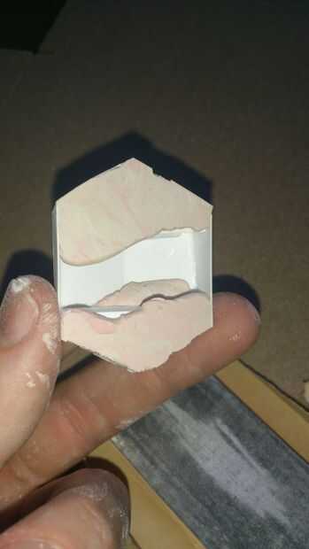 ahora cabe una pequeña cantidad de arcilla en la parte posterior del emblema y pegarlo a un rectángulo de foamex y construir muros alrededor de ella para hacer un molde. Verter la silicona y esperar a la curación.