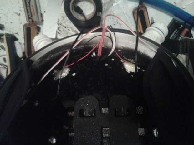 Después de que el cableado se realiza, tan solo calientes pegué lo juntos a los lados del interior del casco. Entonces lo cubrieron con cinta aislante negra para que sea todo limpio y aseado. Quiero los cables quede atrapados en el pelo!  Por último, conecte los cables a EL convertidor de cable y listo!