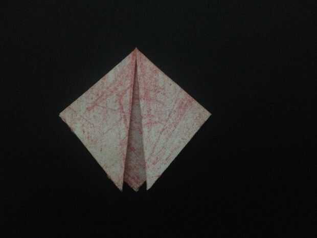 Ok deje empezar con una hoja de papel cuadrada de origami.Paso 1: doblar Empezar con un papel cuadrado en frente de usted.Doblar por la mitad a un triánguloPaso 2: doblar doblar el triángulo por la mitad y luego revelar.Paso 3: doblar imagen le ayuda