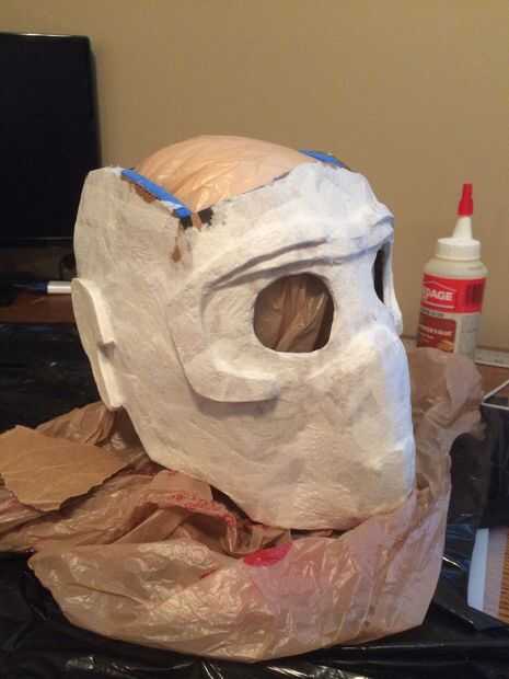 Antes de colocar el tubo de ventilación al casco, papel maché el casco todo con pasta de papel tapiz y papel toalla. Asegúrese de hacer el maché sentarse tan cerca del casco como posible cuidado de saturar la toalla de papel con pasta de papel pintado con un pincel. Una vez seco Conecte los tubos para el casco y los tubos para la conexión de ventilación con la parte flexible de una pajita. Utilizar pasta de papel pintado en lugar de un PVA o solución de agua con pegamento madera porque es más flexible.