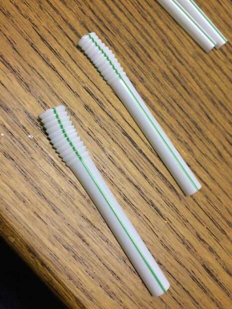 Los tubos de conexión también están hechos de pajas de beber flexibles. La conexión entre los tubos de ventilación se realizó por 1" longitud de corte de 3/8" espiga a 45 grados. Una vez que estos componentes están conectados les capa de pintura de base.