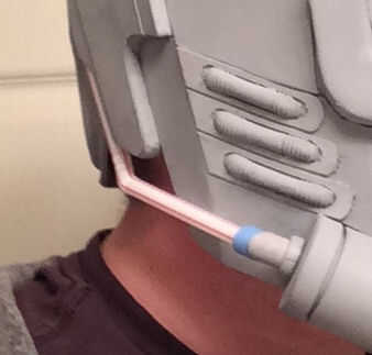 Las piezas laterales están hechas de pajas de beber flexibles. Utilice las líneas en la paja para cortar por la mitad. Corte la parte flexible de la paja en forma de triángulo y poner los dos extremos flexibles usando pegamento caliente. Uniformemente las piezas laterales del espacio en el casco y capa de pintura de base.