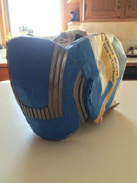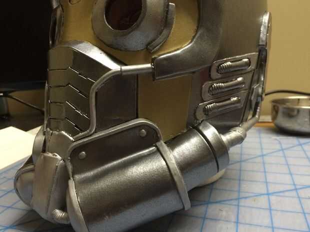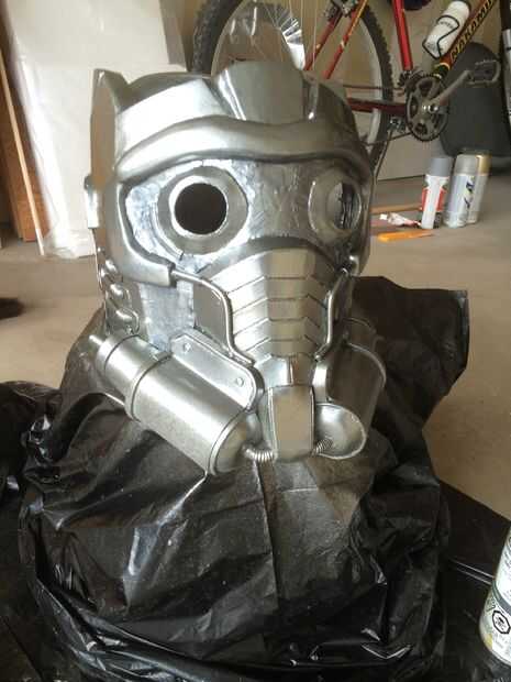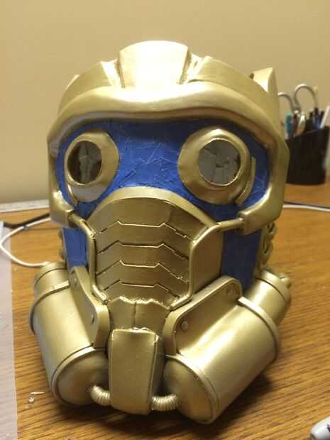 Una vez que el casco está cebado aerosol oro casco entero. Con pintores cinta cubre las piezas de los ojos y las mejillas que quedarían el color oro. Una vez seco pulverizar el casco con pintura de color acero oscurezca. Retire la cinta una vez que todo haya secado por completo.