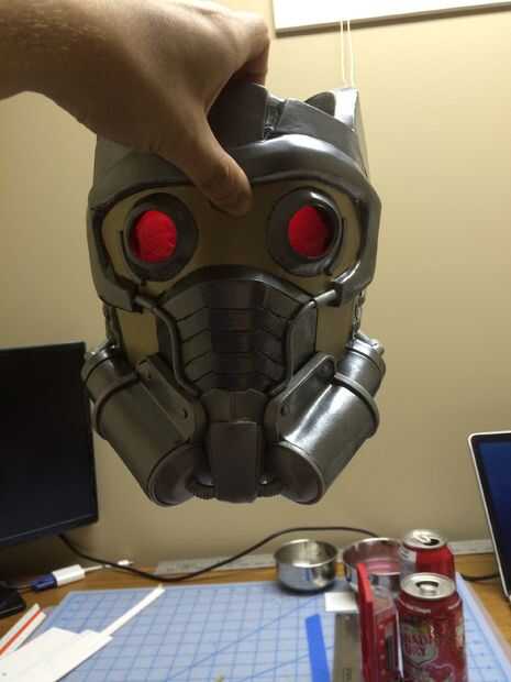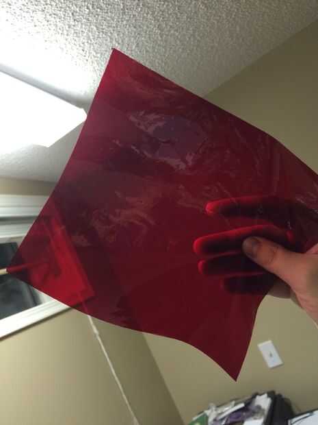 Tenía poco de gel de iluminación roja (color Rosco R26) que corte en pequeños círculos y caliente pegado en el interior del casco. Trabajando en el teatro me da acceso a este material en poco o ningún costo. Te sugiero que si no puede encontrar gel rojo usar lentes gafas de sol color rojo en su lugar.