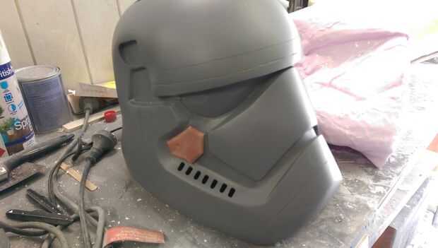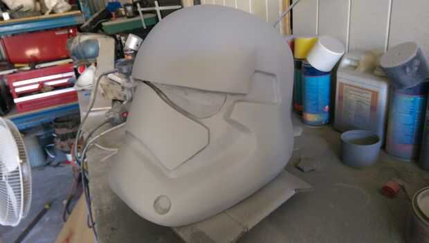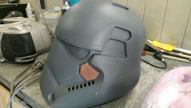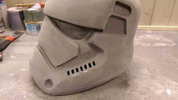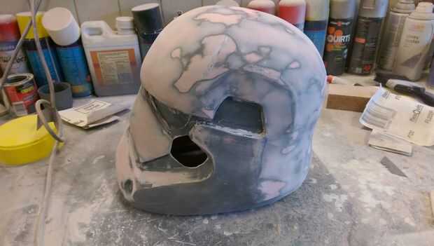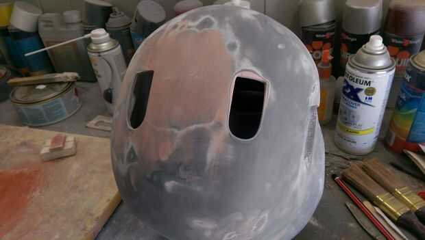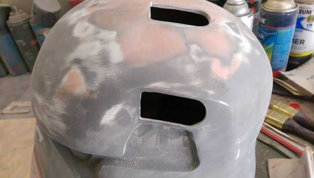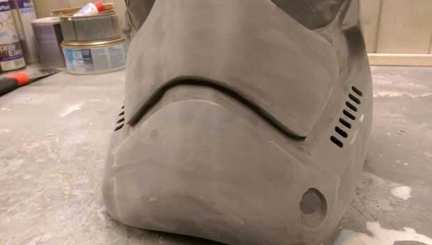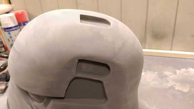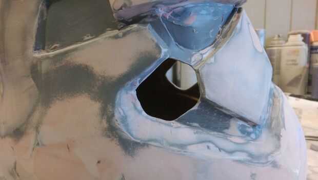No me gusto algunas partes del casco (las partes de la mejilla) y que necesitaba para cortar varios detalles, así que tomó una dremel y cortar varias partes de él. Los agujeros superiores son donde los broches cabeza irá, y a lo largo de la mejilla los orificios necesitan para realizarse. Para los agujeros principales de la mejilla, tomé alguna fibra de vidrio y había parcheado para arriba, lijar otra vez y utiliza arcilla para hacerlos. Para los agujeros superiores tomé algunos restos de madera, corte y pegamento en forma de 'puck', cubiertos en vaselina y llevó a cabo en el agujero mientras untaban algún coche más relleno. El petróleo detiene la masilla se adhiera a la madera y se endurece en forma de bolsillo. Cortar pequeños agujeros a lo largo de la mejilla y vio necesario para construir el labio sea más agudo con algún relleno y generalmente arreglado varias partes del casco.
