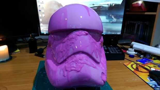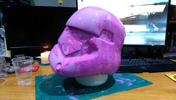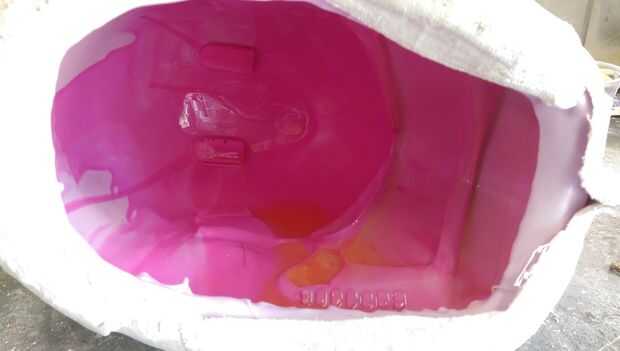 La silicona de Pinkysil es una mezcla de dos partes con una relación 1:1 por volumen, así que vierta partes iguales y mezclar hasta que convierte una luz rosa. Muy delgada vierte, simplemente verter sobre su casco y 'pintar' por lo que recorre toda la superficie (llevaba unos guantes de látex y utiliza las manos para mancharlo). Una vez que la capa de 'detalle' es táctil (no se pega a la mano), se puede aplicar el CloneFX. Va mucho más grueso y funciona del mismo modo, así que su una mezcla de igual volumen y capa de 2-4mm de espesor. Otra cosa que hacerlo pegar algunas claves de registro, que son para ayudar a asegurarse de que el molde se mantiene en el mismo lugar dentro de la mothermold. Que vierte algunas Easycast en pequeñas tazas de mezcla y une los discos curados en el molde.
