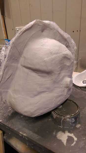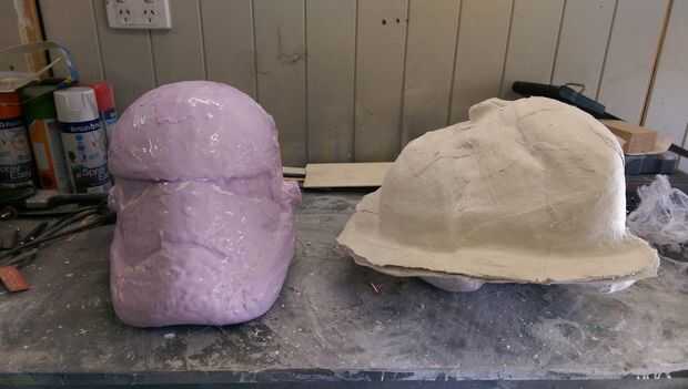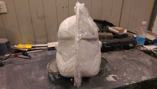 Una vez que es curado el molde, tomar el yeso y empezar a acodar en. Construye una pequeña pared divisoria por la mitad del casco para que la cáscara es fácilmente desmontable y poner la tela en cada lado. Pequeño Consejo, yo uso algunos clingwrap y ponerlo entre las dos mitades de la cáscara de yeso para mantenerlas separadas, de lo contrario pegan y en contra del propósito de la pared. Totalmente no aprender por experiencia, no tan estúpida... Una vez su seco, saque todo y se puede quitar el molde del casco principal original. El molde se puede quitar de 2 maneras, ya sea cuidadosamente pele apagado el molde entero 1 pieza (es posible que la forma es bastante suave y redondo, lo hice y funciono), o cortar una línea irregular de la parte trasera y pele apagado (la línea irregular hace que todo se alinea cuando se pone en el molde).