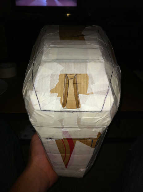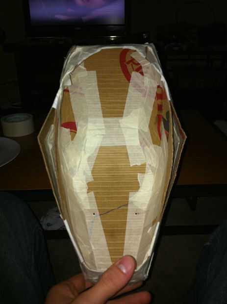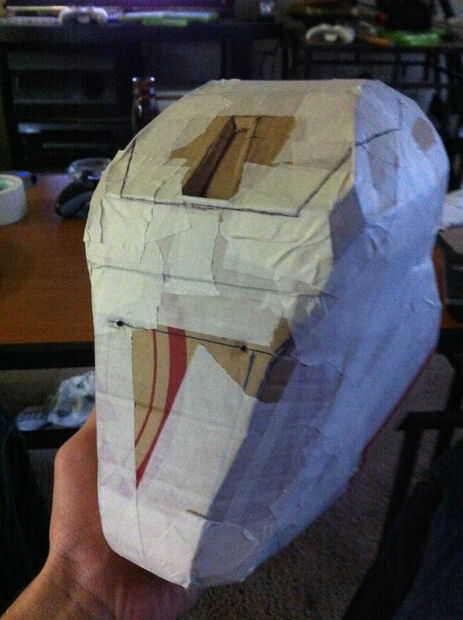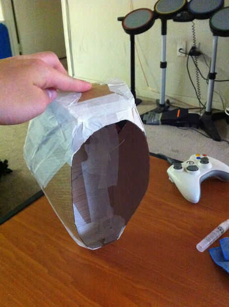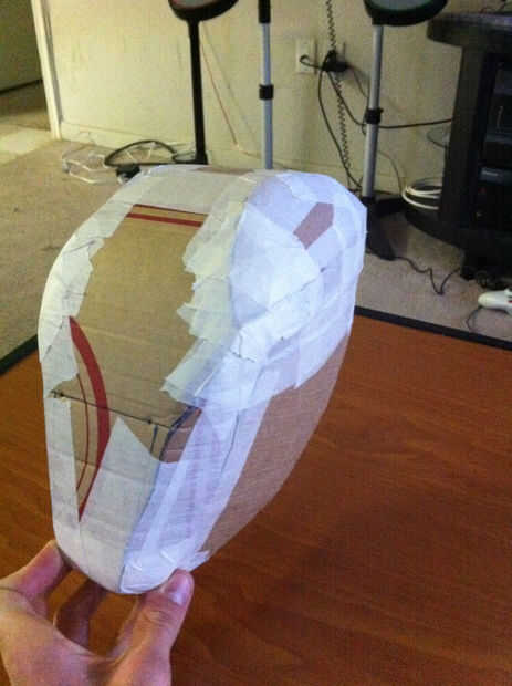 Una vez que se terminó el casco base, cubrí la cosa entera con la cinta adhesiva con la esperanza de que esto permitiría más adelante me retire la cartulina desde el interior del casco a fiberglassing.