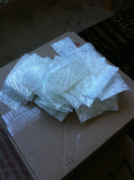 Este proceso es bastante sencillo, y todo lo que sé acerca de él en youtube aprendí, imaginate que. Esencialmente usted necesita reducir su estera de cristal en aproximadamente 2" a 3" tiras. Es mucho más fácil colocar y trabajar con las tiras más pequeñas entonces mayores. En ocasiones puede incluso necesita hacer trozos muy pequeños para detalles, como la indentación en el frente en este casco especial.