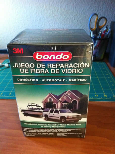 Ahora que está fuera del camino, hemos llegado al punto donde el casco de cartón se ha completado y estamos dispuestos a consolidar este proyecto. He comprado un kit fiberglassing de Autozone que vino con resina, endurecedor y 8 pies cúbicos de fibra de vidrio mate. Este kit encajan perfectamente el proyecto de ley y que sólo terminó la mitad de los materiales que necesitan, tal vez usaré el resto para crear un disco, pero eso es para más tarde instructable.