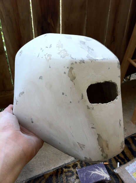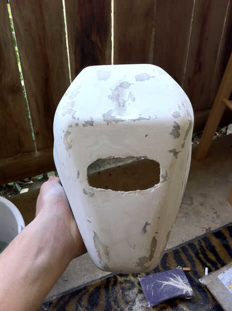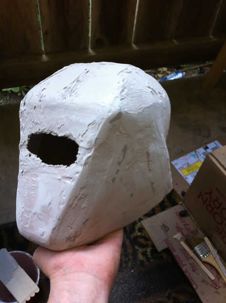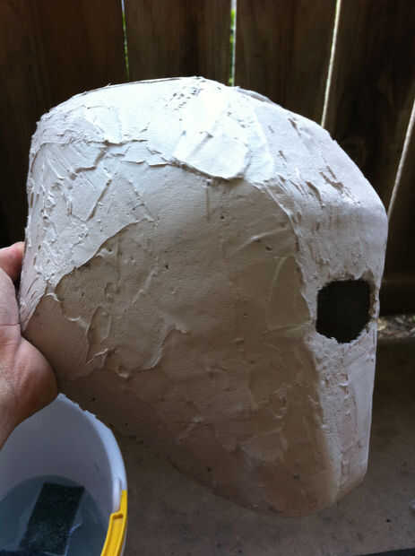 Confía en mí, no obtendrá su casco perfectamente plano y liso de una capa, creo que tardé en algún lugar en el rango de 5 a 6 capas de bondo para llenar cada rincón y grieta y un montón de lijado para hacer que cada nueva capa de la misma altura que la última. La primera capa tendrá que lijar bondo y un poco de la fibra de vidrio que termina mostrando a través de bondo en ciertos lugares. Para la hendidura de la frente utilicé una vez más palitos para colocar y suavizar el bondo como el scrapper plástico que utilicé para el resto del casco era simplemente grande.