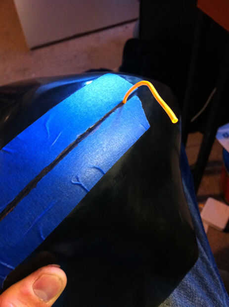 El método que utiliza para conectar la iluminación de el fue perforar agujeros en el extremo de una ranura previamente lavada antes de pintar. Luego alimenta el alambre por los agujeros y alineado en la ranura que se hizo para mantenerla, me fijo en su lugar con pequeños toques de gel de pegamento en la ranura. Al final decidió hacer un alambre lo suficientemente largo para llevar hasta la caja de control en mi bolsillo. Usé dos trozos de alambre de calibre 22 de negro y siempre tubo de 6 pulgadas para unir los dos cables del encogimiento del calor largo cm usado.