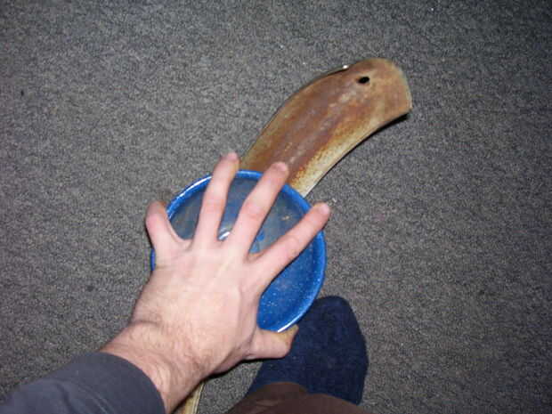 Ahora, toma la defensa de la bicicleta y aplanar un poco. Usé una taza de metal y la perseverancia. Medir la cabeza de borde tuque frente a ala y después corte la defensa a esta longitud.