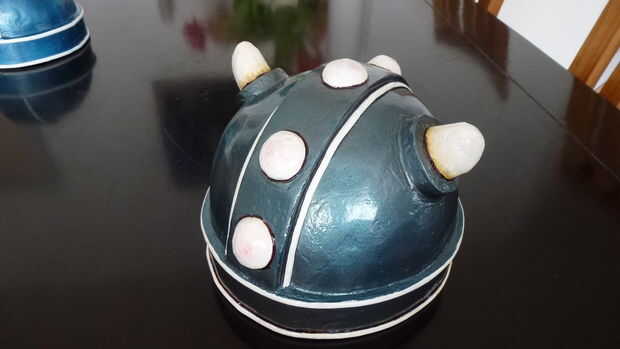 Cubrir las gemas y cuerno con cinta para la próxima coloración. Doblar y sujetar un cartón viejo para un spray de protección y montar el casco en una lata o similar para poder girar y rociar por todos lados.