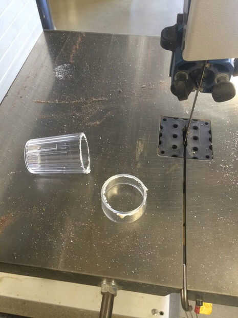 Después de que el pedúnculo estaba completa, comencé en las luces de la cúpula. Amazon Prime entregado estas impresionante 7 oz tazas plásticas que son lentes de Moflash reemplazos completamente adecuada para el ya no hizo (y caro) que se utilizaron en la TV muestran Daleks. El labio fue quitado fácilmente usando la Sierra de banda vertical, haciendo que estas listo para el montaje en una jaula.