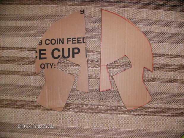 Ahora nosotros podemos empezar! Espero que pueda explicar este proceso bastante fácil, es mucho de ensayo y error. Yo busqué en Google una foto de un Spartan casco por lo que pude ver algunas de las formas básicas. Empecé haciendo la parte delantera de la máscara. Tomar una hoja de cartulina y dibujar así que va a la corrigation verticalmente, será muy útil más adelante. Lo hice en dos mitades porque hay un fuerte pliegue hacia abajo la parte delantera y creo que sólo podría lograrse uniendo las dos mitades. Dibujaba la forma básica de la máscara y lo sostuvo hasta mi cara para que coincida con proporciones y también se usa una regla para medir. Corte mi forma y llevó a cabo otra vez a mi cara, marcando con un lápiz que piezas necesitan ser retocado. Usé un boxcutter y cortado nada más necesitaba para luego remontar la forma y cortar la imagen del espejo. Las dos mitades de su máscara de lado lo que decide ser el reverso de la cinta.