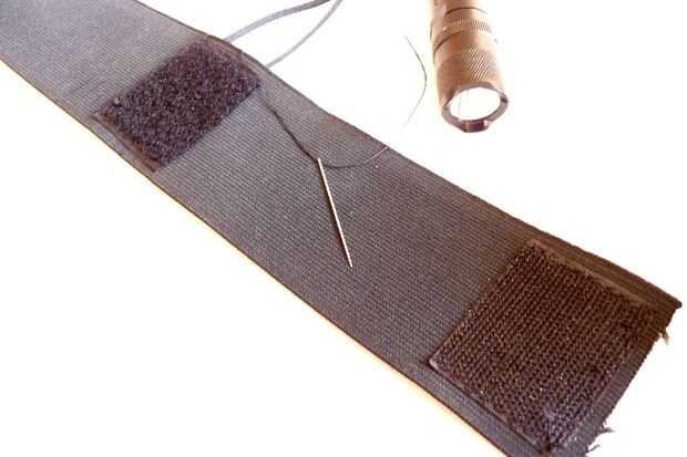 Los dos Velcros de cosido. El uno en el borde de la cinta elástica y el otro en la parte superior donde se llevará a cabo la linterna.
