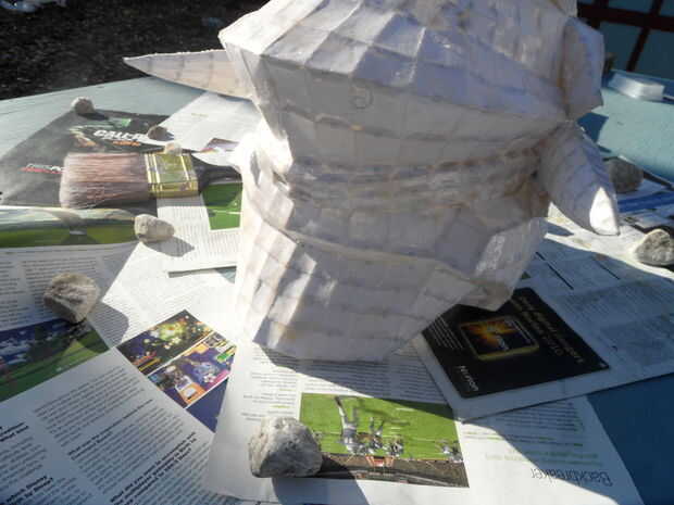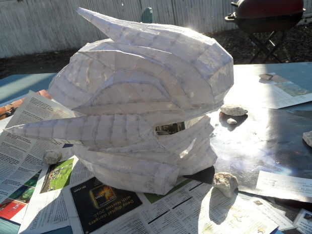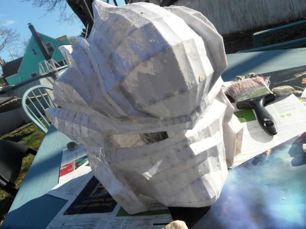 usando un cepillo y un recipiente pequeño para mantener la resina, comenzar a aplicar la resina en el casco, asegúrese de aplicar sólo una capa delgada de resina en el casco. el casco debe tener un color amarillento brillante que después de aplicar la resina.