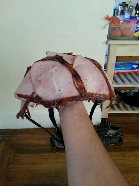 Esta es la tercera iteración de una solicitud de cumpleaños de un amigo para "un sombrero hecho de tocino". Mientras que no de tocino este año, se hace rodajas jamón y cerdo desigual. Lo bueno es que no tienes que cocinar la carne permanece dimensionalmente estable y puede utilizar una forma que no sea horno, simplificando enormemente la construcción.